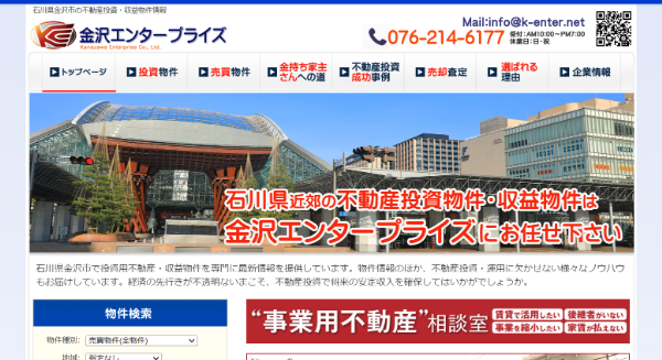 石川県近郊の投資物件・収益物件を中心に扱う金沢エンタープライズ。その不動産売却サービス・買取サービスなどについて調査しました。
